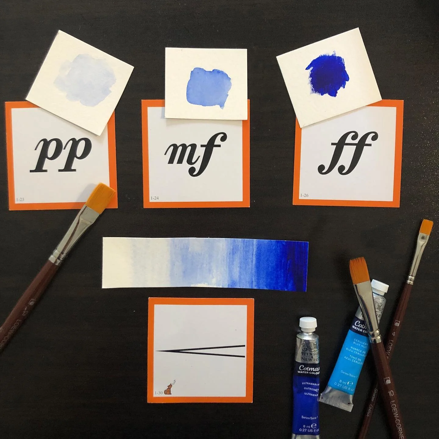 Explore the connection between dynamics in music and dark & light values in art. Watercolor paints work best! Pianissimo is represented by paint mixed with lots of water. It looks light, transparent, and almost "see-through." Fortissimo is represented by dark, heavy, saturated paint, with less water. You can even paint a crescendo!